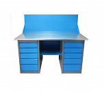 Верстак двухтумбовый поставляется в разобранном виде (4 элемента). Нагрузка на столешницу до 600 кг. Стандартный цвет: корпус - серый глянец RAL 7030, ящики и двери тумб - синий RAL 5017.  Размеры: 855x1600x700 мм. Масса: 83 кг.