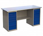 Двухтумбовый. Допустимая нагрузка на столешницу 1000 кг. Опорные элементы выполнены сварными из холоднокатаной стали. Для выполнения сборочных, ремонтных, слесарных, монтажных и других видов работ на производстве, в сервисных центрах, мастерских, гаражах, а также для обучения технологии в учебных заведениях. Комплектуется полкой-стенкой, расположенной под столешницей для удобного размещения габаритного инструмента и оснастки. Размеры верстака: 855x1796x696 мм. Вес: 121 кг. Поставляется в 4 комплектациях на выбор.