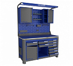 Нагрузка на столешницу 1500 кг. Столешница из листа влагостойкой фанеры марки ФСФ толщиной 40 мм и листом горячекатаной стали толщиной 5 мм. Рама верстака выполнена их холоднокатаной стали. Модуль верстака выполнен сварными. Ящики в модулях устанавливаются на шариковых телескопических направляющих полного выдвижения. Квадратная перфорация для установки крючков, держателей. Размеры: 1982x1993x743 мм.