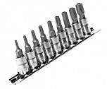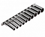Головки изготовлены из закаленной хром-ванадиевой стали. Полированная поверхность. В набор входит планка крепления и хранения головок.Набор 9 предметов (Е10, Е11, Е12, Е14, Е14, Е16, Е18, Е20, Е22, Е24).