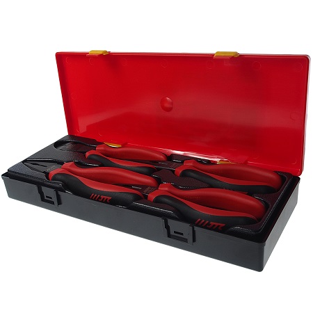 Набор съемников стопорных колец (щипцы) (4 предмета) в прочном презентабельном боксе. Изготовлено из хром-ванадиевой стали, что обеспечивает высокую прочность и жесткость инструмента.