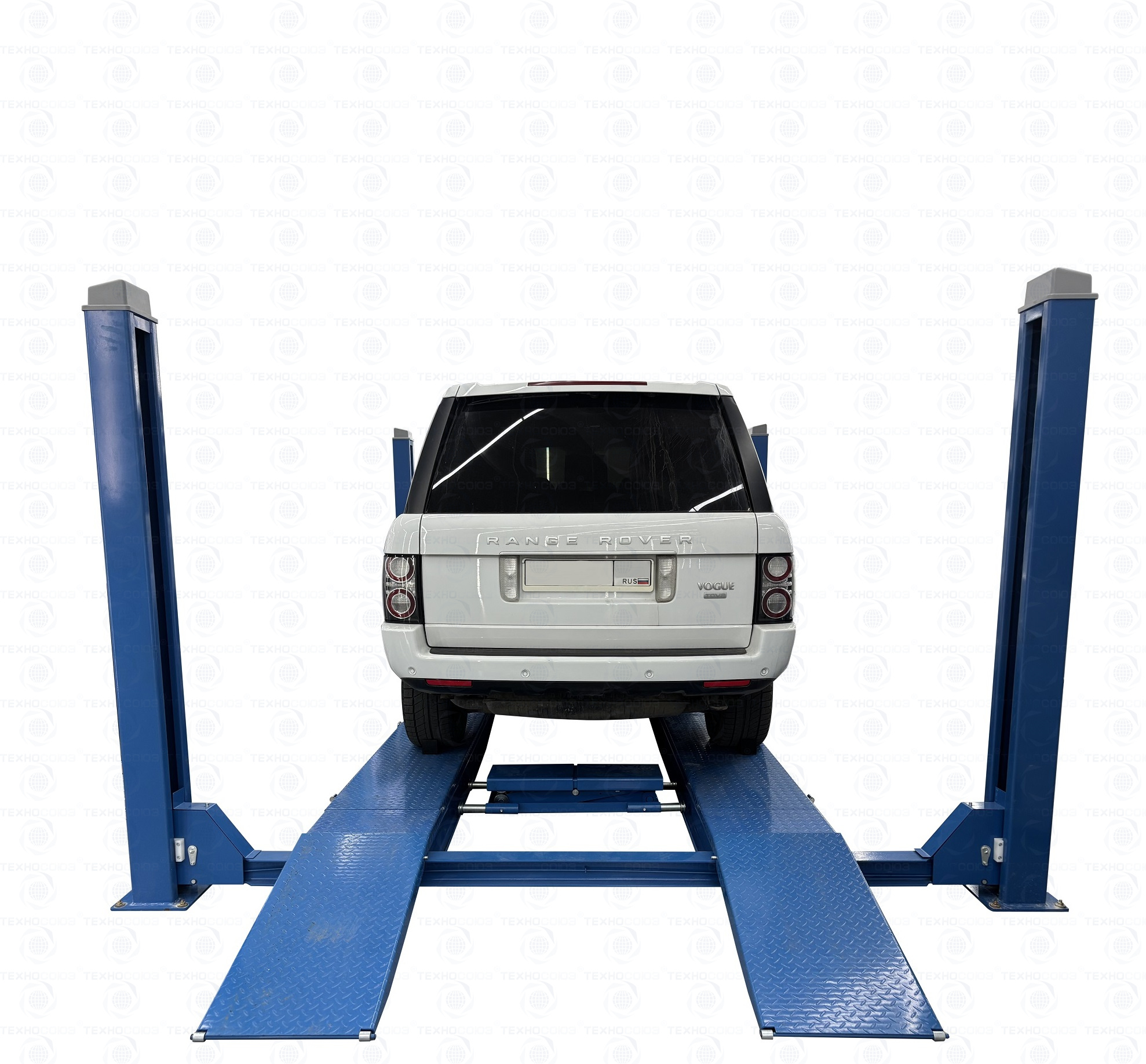 Комплект четырехстоечный подъемник для сход-развала ВСЕХ авто. Длина платформ 4850 мм. г/п.-4,0т. Для сход-развала ВСЕХ АВТО!!! В комплекте: Немецкий насос «Bucher hydraulics». Гарантия 2года + траверса 2т. + анкерные болты 16шт. + противооткатные ограничители 2шт. + противооткатные упоры 2шт. Для любых стендов сход-развал - 3D, лазерных, инфракрасных, кордовых. ВАЖНО!!! ДЛИННЫЕ ТРАПЫ -4800мм. — это позволяет прокатывать авто на подъёмнике. Многие стенды развала требуют прокатки!!! Подъём 1800мм, Между колоннами 2910мм. Усиленный — 1280кг металла.