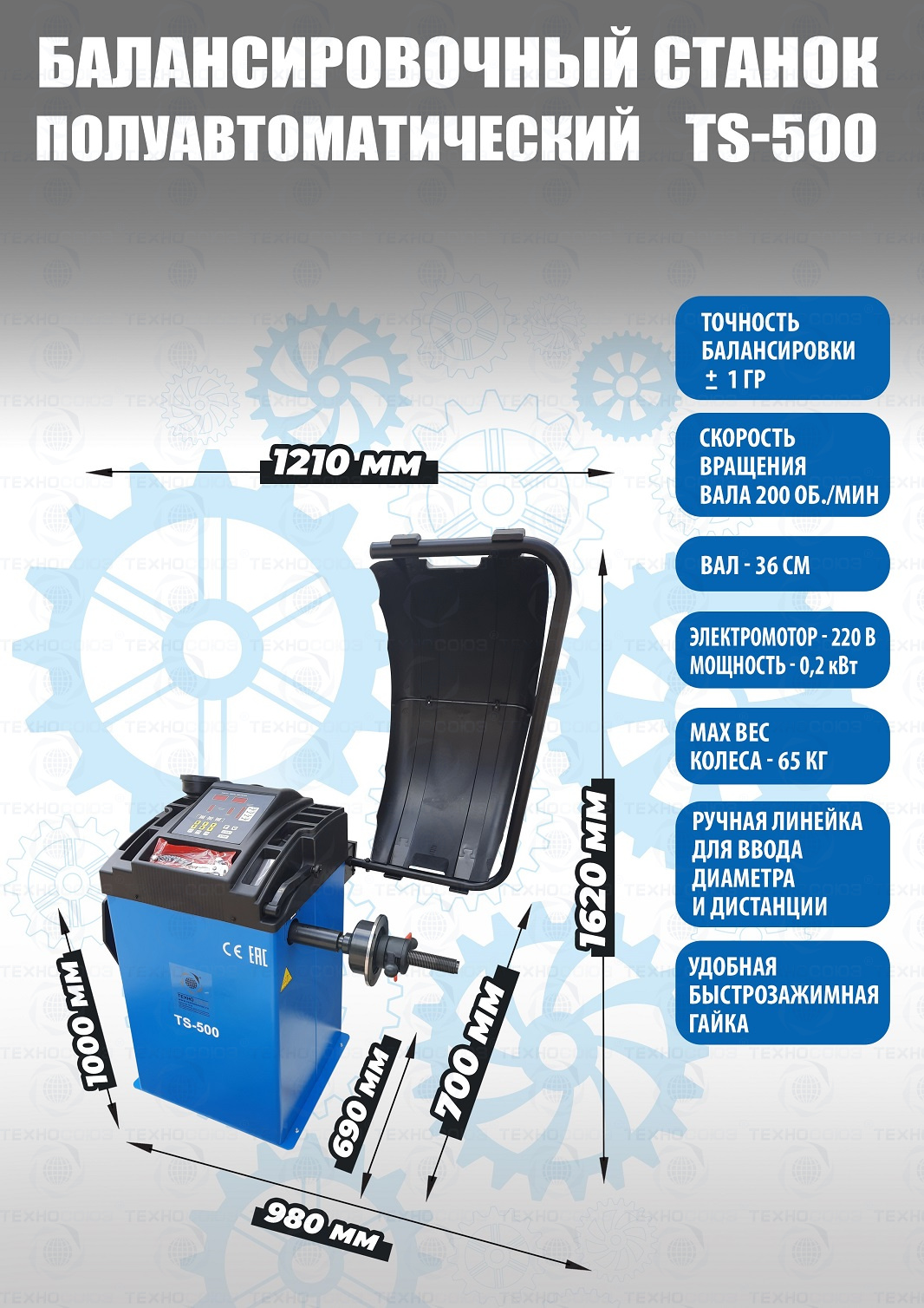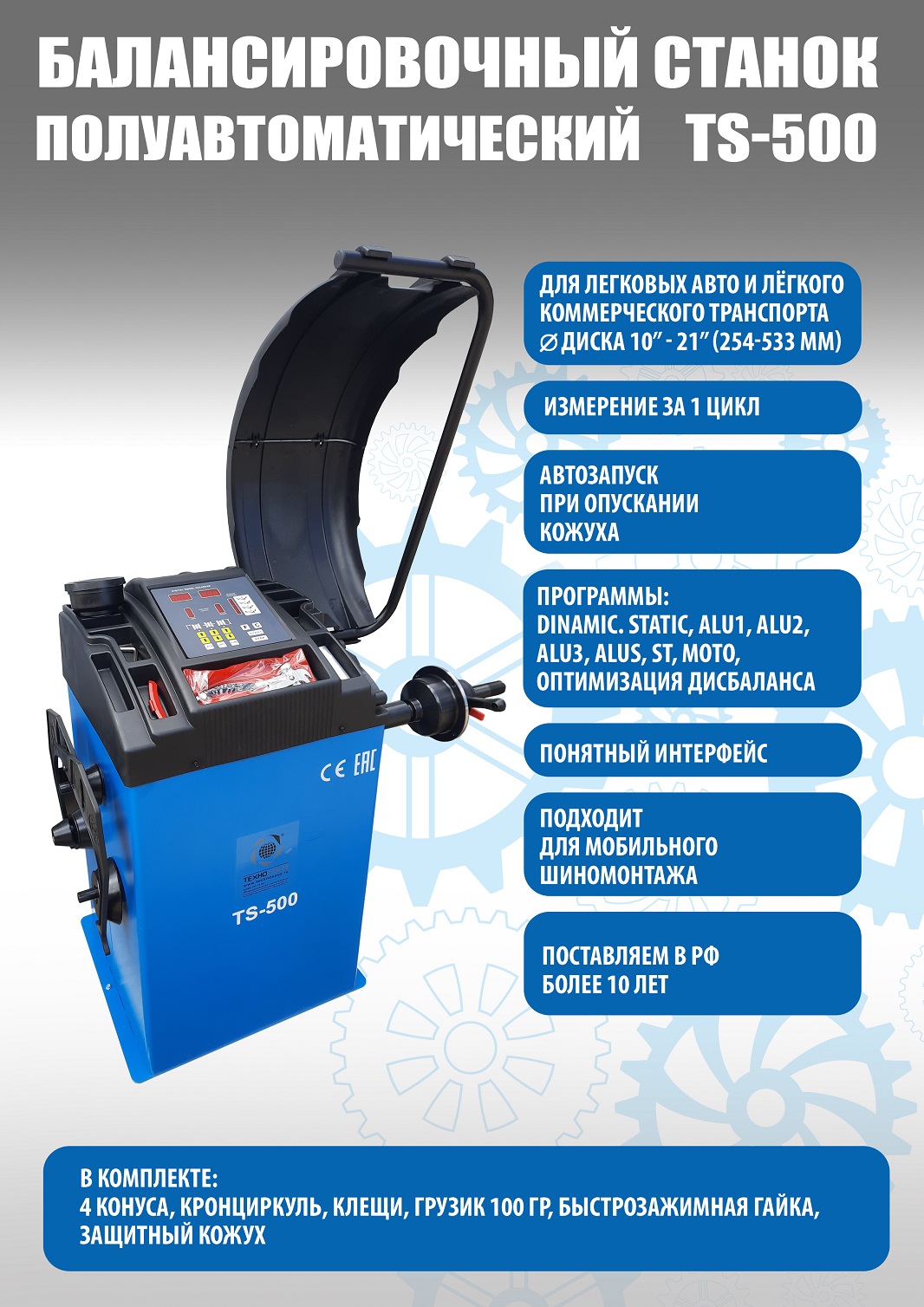 + TS-500 Балансировочный станок. В комплекте: кожух с автозапуском + клещи + кронциркуль + быстрозажимная гайка + набор конусов. Для колес диаметром до 760мм. Размеры диска: ширина 3–9” (76-228 мм) , диаметр колеса" - 10–21” (254-533 мм). Максимальный вес колеса с диском – 65 кг. C кожухом. Точность ±1гр. Напряжение 220В. Данные станки возим более 10 лет. Надежные - в сезон не подведут!