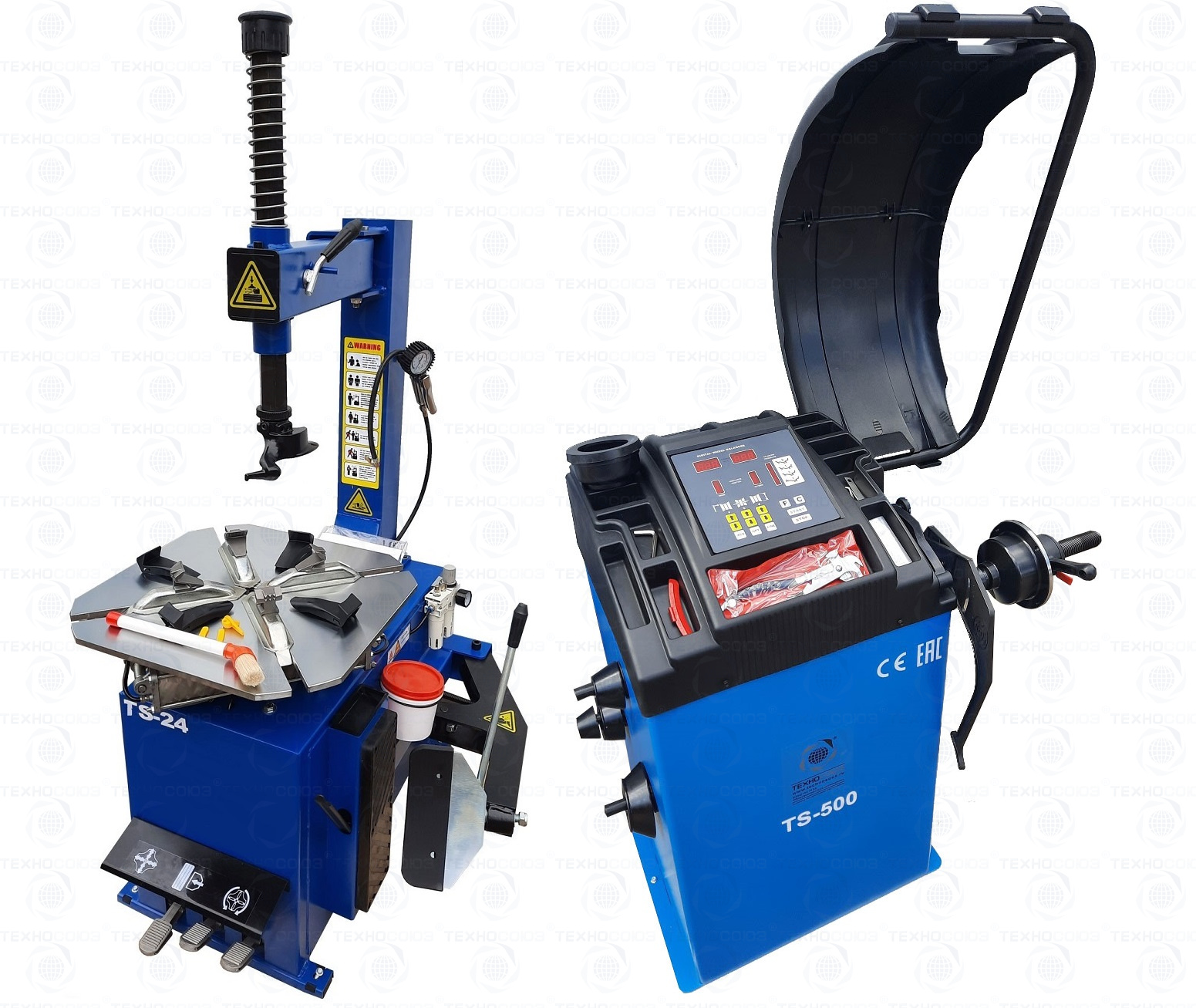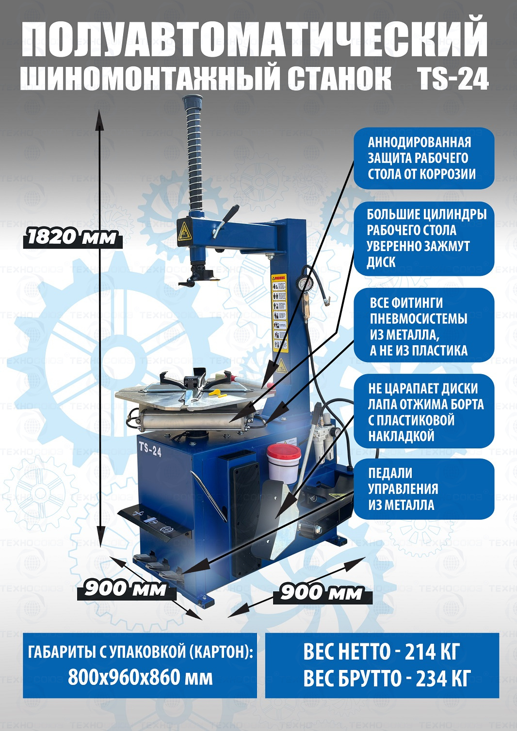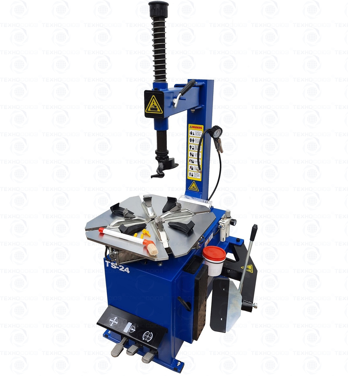 TS-24 шиномонтажный станок. Полуавтоматический. Квадратный стол. Рекомендуется для постов со средней и высокой проходимостью. Для дисков: внешний 11÷21”, внутренний 12÷24”.  Усилие отрыва покрышки 2700 кг. В комплекте: пистолет для подкачки шин + монтажка + пластиковые накладки на зажимные кулачки + регулятор давления с влагоотделителем и манометром. Поставляем на 220В и 380В.
