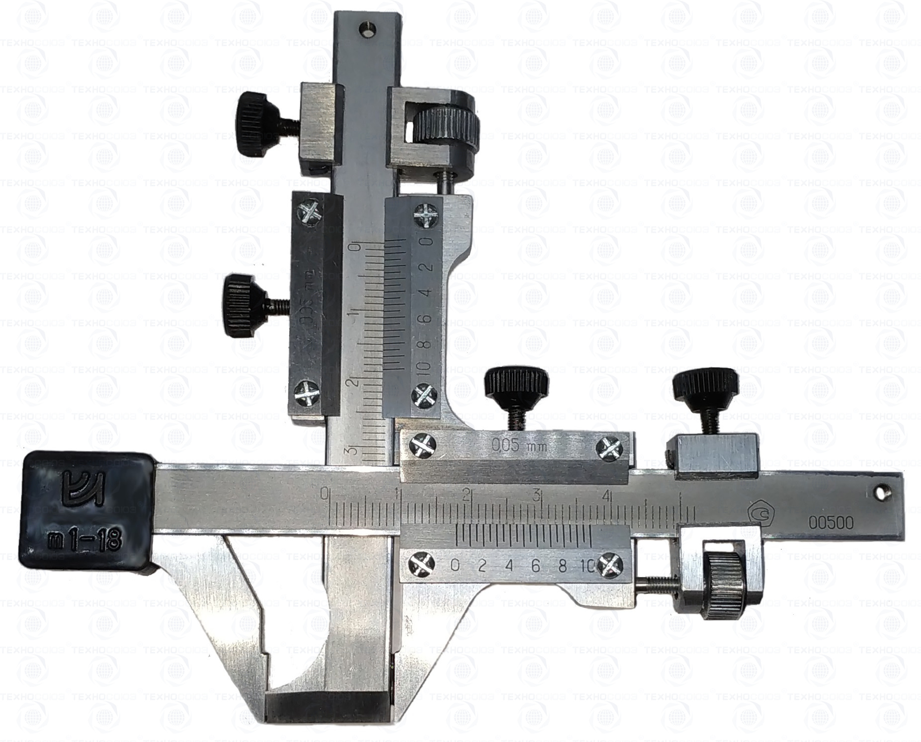 В рамке с неподвижной губкой в двух взаимно перпендикулярных пазах перемещаются штанга с подвижной губкой и высотная линейка. На штанге и высотной линейке нанесены углубленные шкалы, что предотвращает их износ при перемещении в рамке. Рамка снабжена нониусами. Для точной установки на размер высотной линейки и штанги с подвижной губкой служат микрометрические подачи, а для их фиксации - стопорные винты. Шкалы штанги, высотной линейки и нониусов выполнены с матовым хромовым покрытием, исключающим бликование. Остальные поверхности штангензубомера имеют блестящее хромовое покрытие.