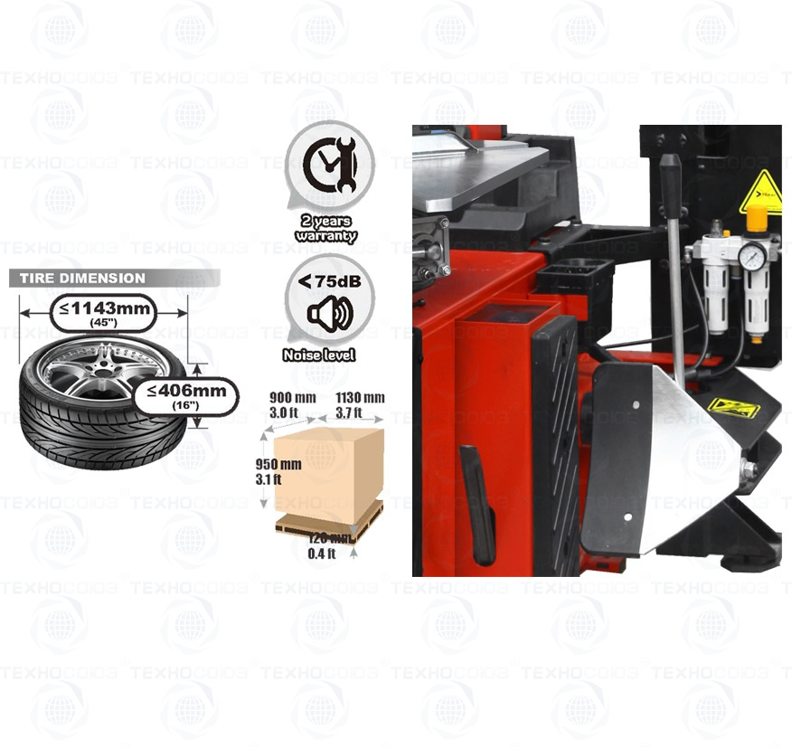 Максимальная покрышка: Ø1143x406 мм (45"÷16"). 3-я рука в комплекте. Гарантия 18 мес – наш монтаж, 12 мес – самостоятельная установка.
