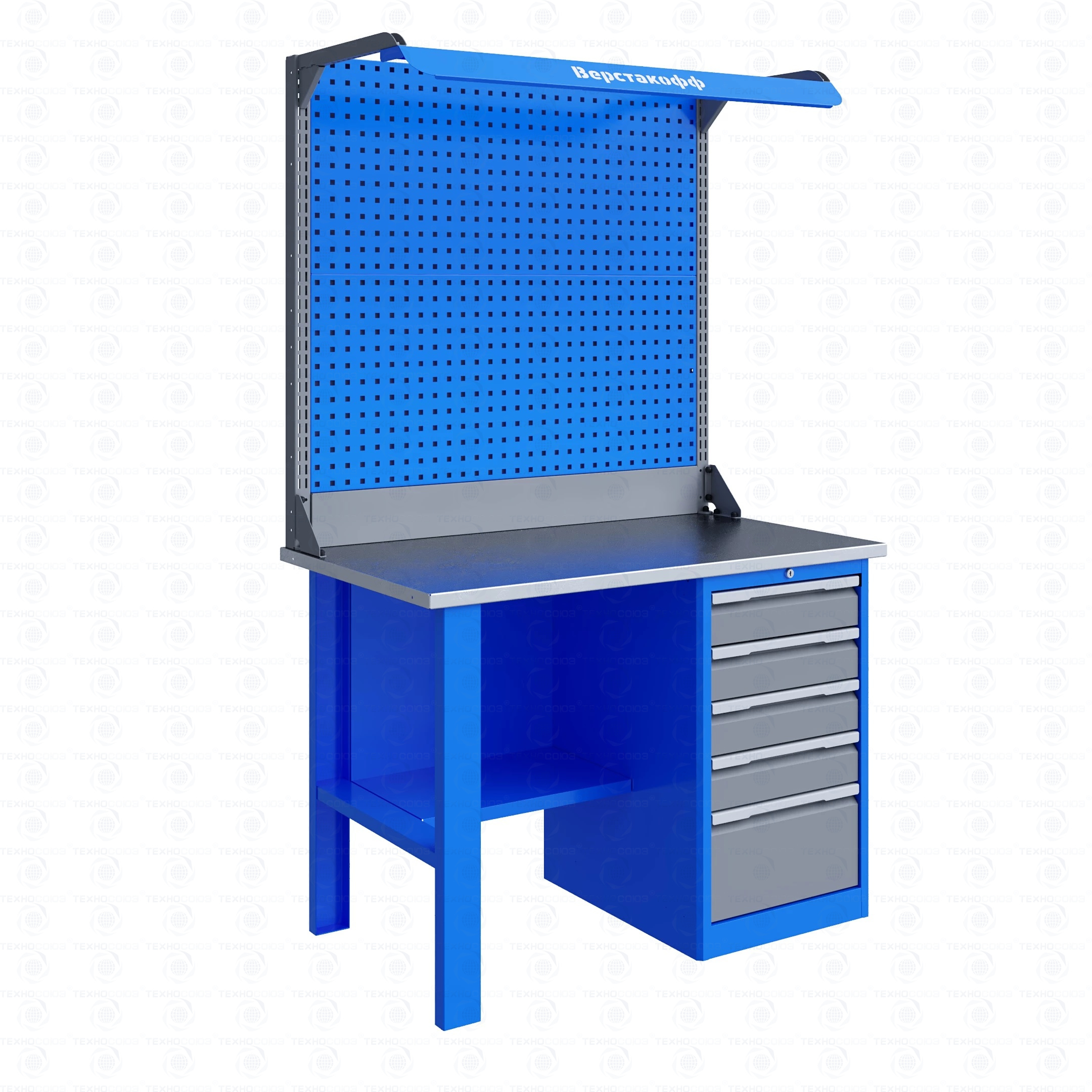 Тумба верстака - сварная. Ящики в тумбе устанавливаются на шариковых телескопических направляющих полного выдвижения. В тумбе P5 установлено четыре малых и один большой ящика. Внутренние размеры малых ящиков (ВхШхГ), не более: 103 х 397 х 520 мм. Внутренние размеры больших ящиков (ВхШхГ), не более: 222 х 397 х 520 мм. Тумбы с ящиками снабжены общим центральным замком с поворотом ригеля 180 градусов и подпружиненной тягой. В комплекте два ключа.